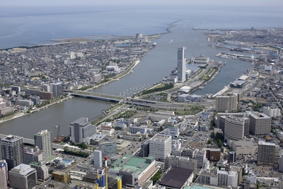 東光線十字路を手前に信濃川、柳都大橋、新潟朱鷺メッセ