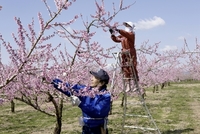 モモの受粉作業 後方吾妻連峰