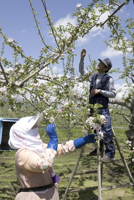 リンゴの受粉作業