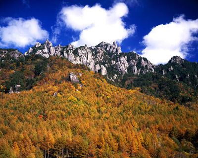 瑞牆の森のカラマツ林黄葉と瑞牆山
