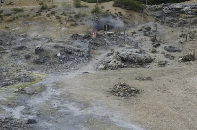 大湯沼と地熱発電資源量調査の掘削基地の水蒸気噴出