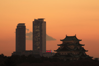 名古屋城と高層ビルの夕景