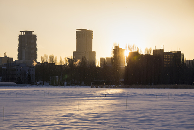 北海道大学の農場より望む日の出と札幌市街