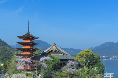 桜咲く厳島神社の五重塔