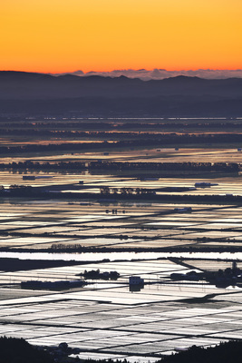 八郎潟水田地帯と八郎潟調整池の朝