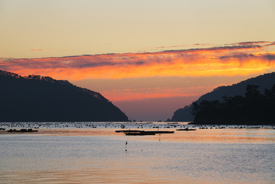 山田湾の日の出と養殖イカダ