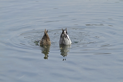 ヒドリガモ雄と雌、川底の水草を食べる