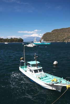 戸田港から望む雪の富士山と漁船