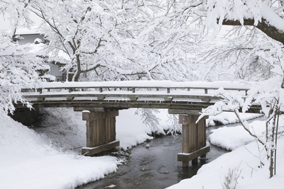 雪の新名庄川と八海橋一号