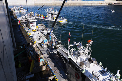 ウトロ漁港のサケの水揚げ作業