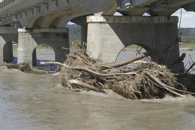台風の豪雨で橋脚に引っ掛かった木