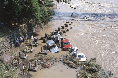 台風の豪雨で壊れた蛇かご、大井川下流