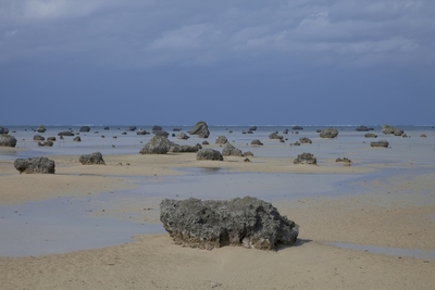 伊良部島の浅瀬の海に大岩が転がる佐和田の浜