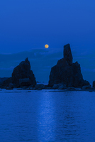 日本海に沈む赤い月と松前小島(右)