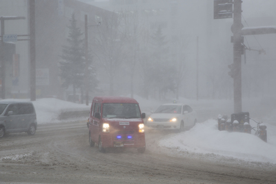 吹雪の札幌市街を走る自動車