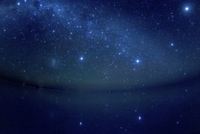 ウユニ湖に沈む竜骨座とカノープス、大マゼラン星雲、おお犬座と木星(右上)