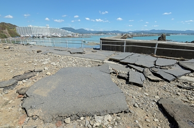 台風の被害 めくれた遊歩道のアスファルト