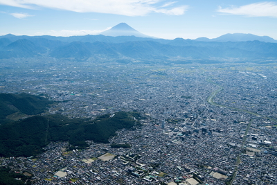 甲府盆地(甲府駅と甲府市の街並みより富士山方面)