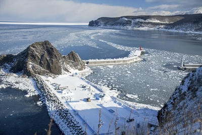凍りはじめる宇登呂港と押しよせる流氷