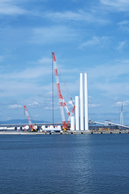 石狩湾新港と風力発電のブレード取付