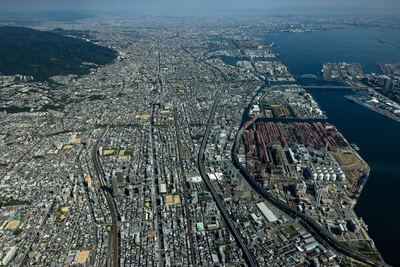 東川崎町(神戸港)周辺の工場群より神戸港と神戸市街地