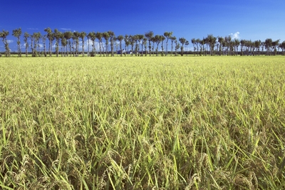 新潟産コシヒカリと満願寺稲架木並木。新潟平野