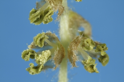 ケヤキ雄花、葯が破れ花粉が飛散