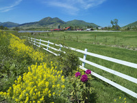 牛の放牧と新緑のポプラ並木と蒜山・蒜山高原