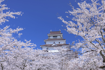 桜の鶴ヶ城公園と会津若松市街