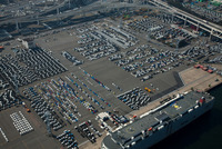 大黒ふ頭地区の輸出用車輌群と自動車運搬船