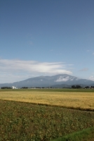 実った稲と転作大豆畑 子後方弥彦山