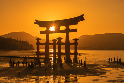夕日に輝く厳島神社の大鳥居