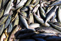 ウトロ漁港の水揚げされたサケ