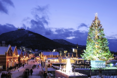 金森倉庫群と函館山雪景 重要伝統的建造物群保存地区