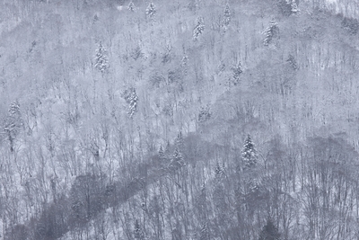 針葉樹の森に雪が降る