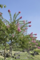 旧芝離宮恩賜庭園に咲くサルスベリと高層ビル