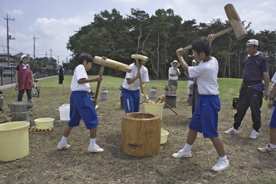 餅つき、蒸したもち米を杵で潰す