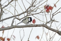 シジュウカラ雌 幼虫を足で押え食べる
