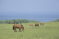 馬の牧場とオホーツク海