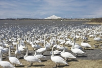 大沼のハクチョウと利尻山