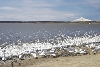 大沼のハクチョウと利尻山