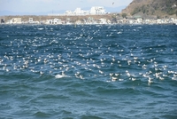 ニシンの群来が見られた海岸に集まるカモメ