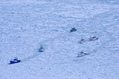 流氷に閉じ込められたスケソウダラ漁船