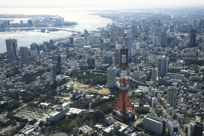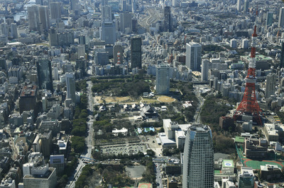芝公園と東京タワー,麻布台ヒルズ周辺より東京の街並み