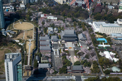 満開の桜の大本山増上寺と芝公園と東京タワー,六本木方面