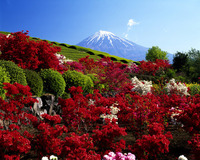 ツツジ咲く茶畑と富士山