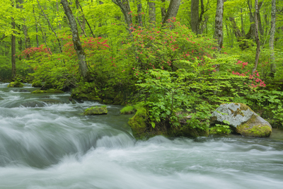 ツツジ咲く新緑の奥入瀬渓流