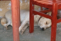 椅子の下で眠る犬