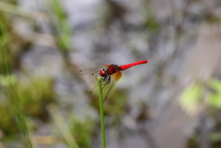 湿地の草に止まっているハッチョウトンボ
