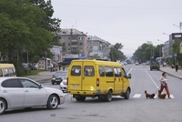 市街地の道路と横断歩道を渡る人